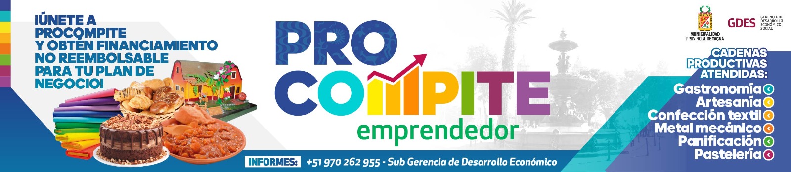 Con el propósito de apoyar la competitividad productiva, la Municipalidad Provincial de Tacna, mediante Acuerdo de Consejo Regional N°32-2024, aprueba el monto de un millón de soles, para la implementación del PROCOMPITE EMPRENDEDOR MPT 2024